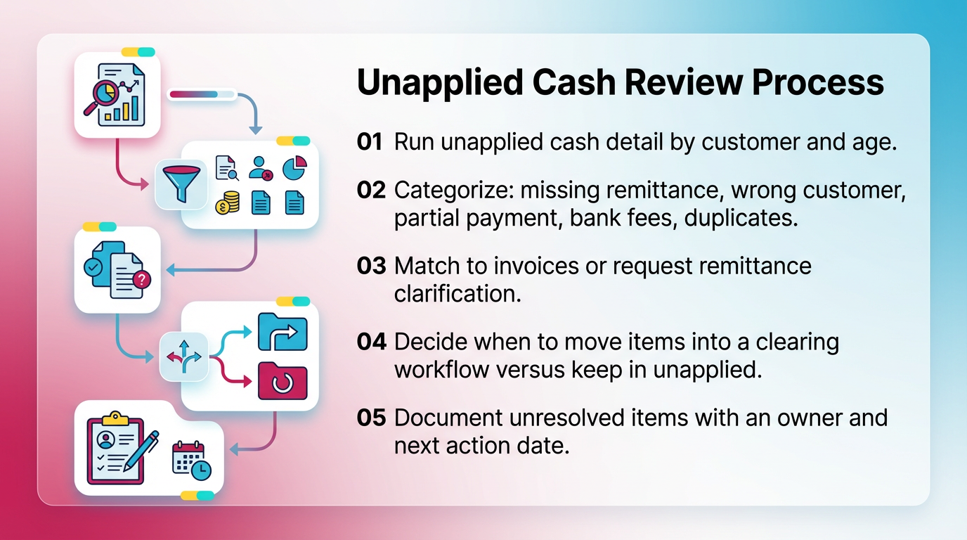 Unapplied cash is customer cash not matched to an invoice. If left unresolved, it can overstate AR, distort the aging, and hide collection performance issues.