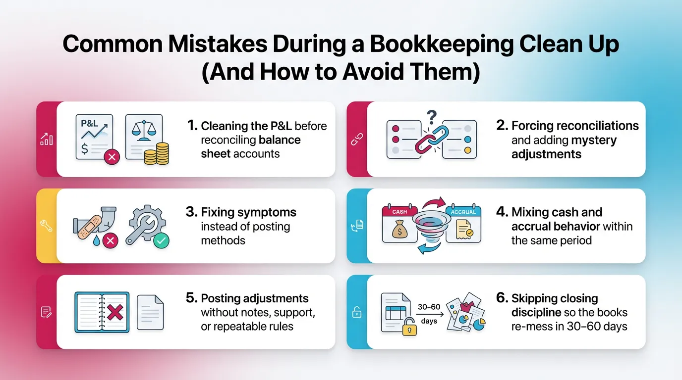 Bookkeeping clean up is the process of reviewing, correcting, and reconciling financial records so the P&L, balance sheet, and supporting ledgers reflect what actually happened for a period.