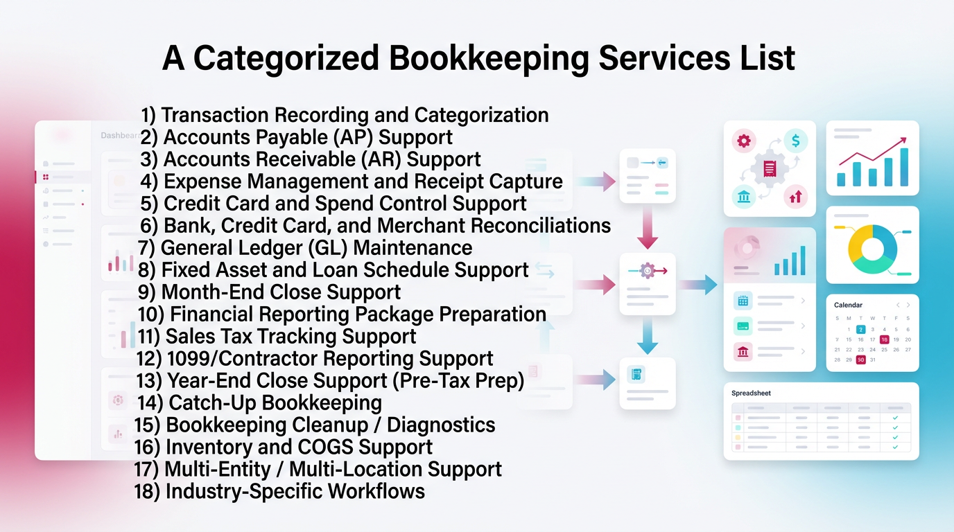 - A bookkeeping services list works best when you group work by frequency. Daily flow, monthly controls, and year-end readiness.