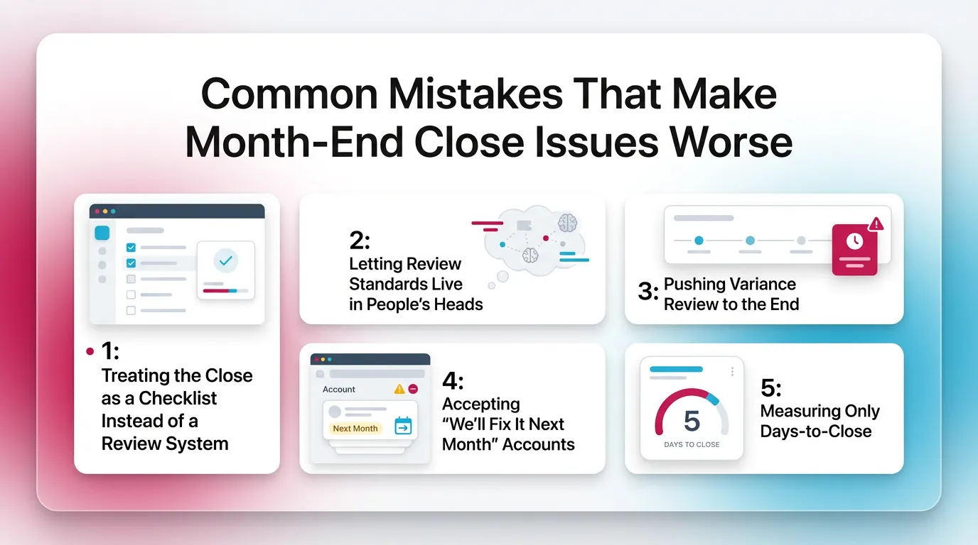 Delayed reconciliations, manual data entry and matching, missing documentation, late approvals, inconsistent review standards, and last-minute adjustments.