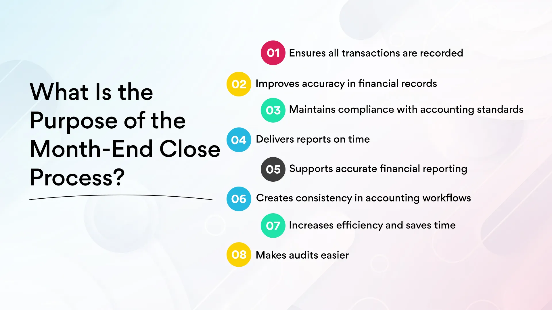 One key purpose of the month-end close process for financial reporting is completeness. The accounting team checks that every invoice, expense, payment, and journal entry for the month has been properly recorded—nothing missing, nothing overlooked.