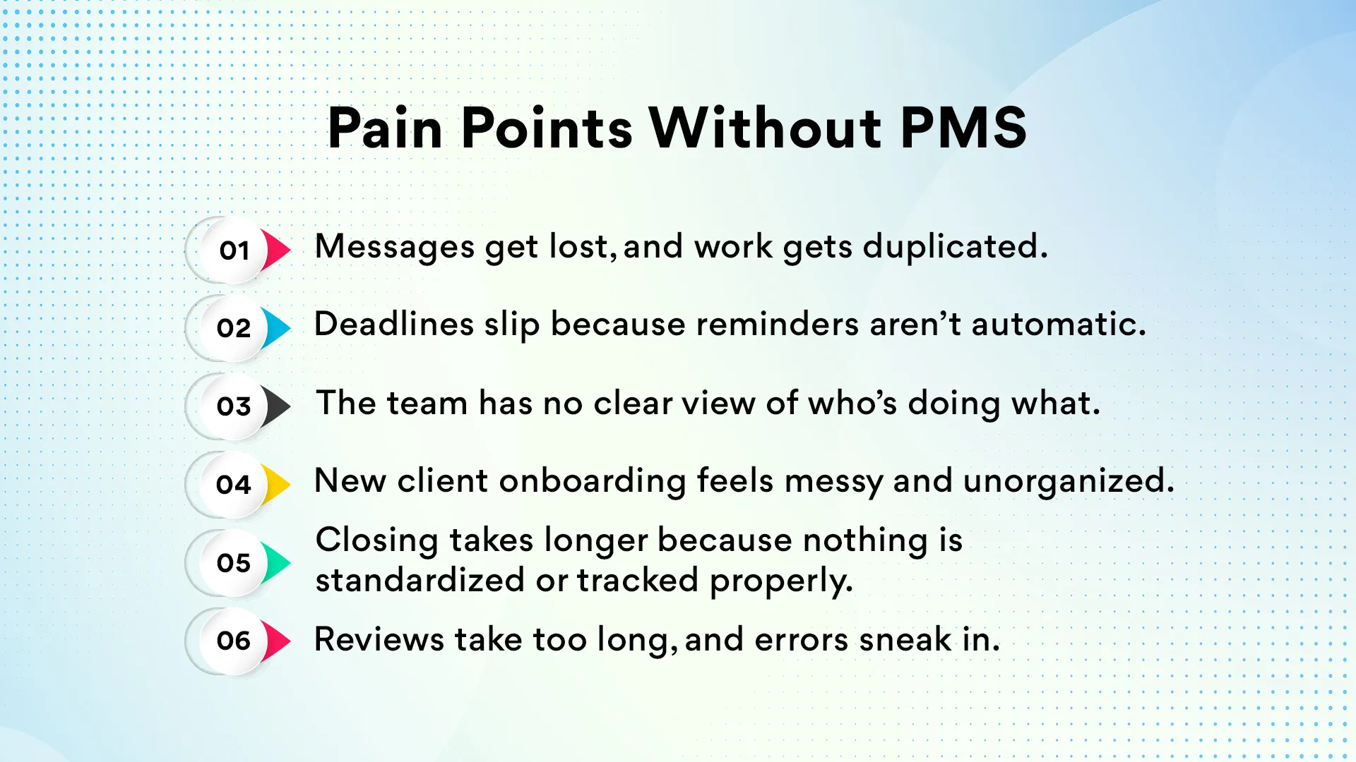 If your day revolves around recurring tasks, monthly closes, and chasing clients for documents, PMS is a lifesaver. Automated checklists, reminders, and client portals streamline everything.