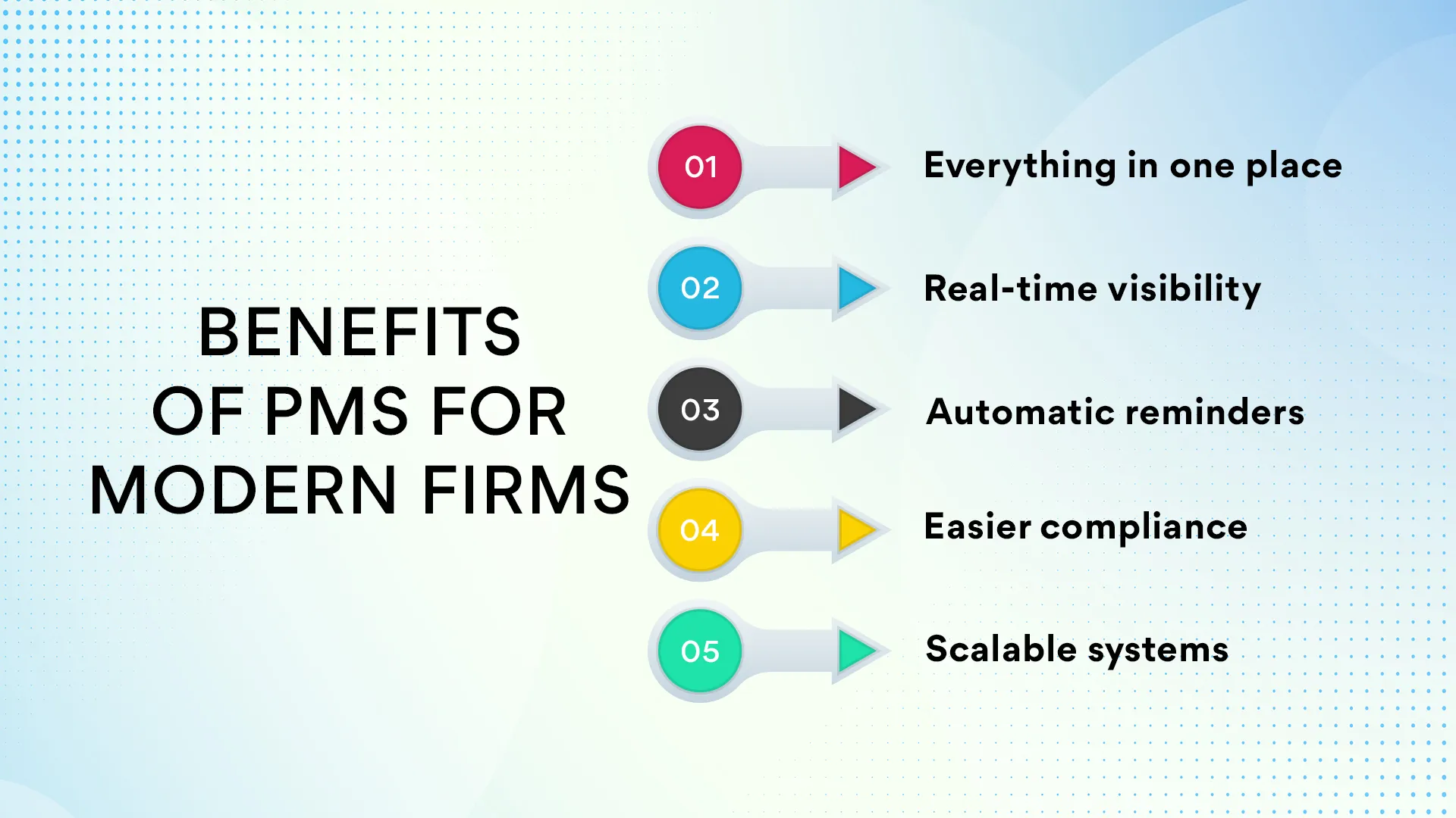 - U.K. firms rely on PMS during MTD scaling phases and to stay GDPR-compliant. Most accounting practices feel the need for PMS once they hit 20–30 clients, as manual tracking of VAT, PAYE, and Companies House deadlines quickly becomes unmanageable.